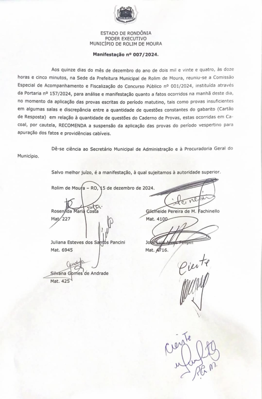 | 17/12/2024 Prefeitura de Rolim de Moura cancela integralmente provas do concurso e determina prazo para nova aplicação e devolução da taxa aos desistentes |
